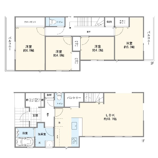 都市ガス、公営水道、公共下水、駐車場2台以上、緑豊かな住宅地、閑静な住宅地、南側道路面す、前道6m以上、スーパーが近い(10分以内)、2沿線以上利用可、小学校徒歩10分以内、保育施設・幼稚園5分以内、公園5分以内、シューズインクローク、対面キッチン、パントリー、都市ガス、システムキッチン、ガス3口、対面キッチン、食器洗い機付き、浄水器、IHクッキングヒーター、I型キッチン、パントリー(食器・食品の収納庫)、ユニットバス、追い焚き、浴室乾燥機、ウォシュレット、トイレ2ヶ所、浴室に窓、暖房便座、浴室暖房、バルコニー2面、南面バルコニー、2階建、LDK18畳以上、採光2面、採光3面、全室南西向き、全室フローリング、リビング階段、クローゼット、収納、全居室収納、シューズインクローク、シャンプドレッサー付き、フラット35Sに対応、モニタ付きインターフォン、24時間換気システム、建物10年保証