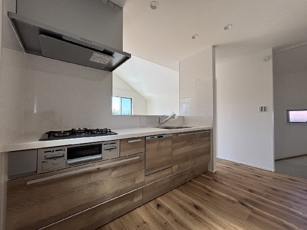 都市ガス、公営水道、公共下水、駐車場1台、緑豊かな住宅地、閑静な住宅地、2沿線以上利用可、保育施設・幼稚園5分以内、対面キッチン、都市ガス、眺望良好、システムキッチン、ガス3口、対面キッチン、I型キッチン、ユニットバス、追い焚き、ウォシュレット、トイレ2ヶ所、浴室に窓、暖房便座、バルコニー、2階建、LDK15畳以上、全室2面採光、フローリング、リビング階段、クローゼット、収納、下駄箱、全居室収納、シャンプドレッサー付き、フラット35Sに対応、モニタ付きインターフォン、24時間換気システム、建物10年保証、勾配天井
