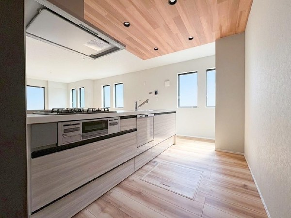 都市ガス、公営水道、公共下水、駐車場1台、緑豊かな住宅地、閑静な住宅地、前道6m以上、始発駅、2沿線以上利用可、小学校徒歩10分以内、中学校徒歩10分以内、保育施設・幼稚園5分以内、公園5分以内、コンビニ5分以内、シューズインクローク、ウォークインクローゼット、対面キッチン、都市ガス、システムキッチン、ガス3口、対面キッチン、食器洗い機付き、浄水器、I型キッチン、ユニットバス、追い焚き、浴室乾燥機、ウォシュレット、トイレ2ヶ所、浴室に窓、暖房便座、浴室暖房、バルコニー、南面バルコニー、2階建、LDK15畳以上、採光3面、全室2面採光、全室フローリング、リビング階段、クローゼット、ウォークインクローゼット、収納、床下収納、下駄箱、全居室収納、シューズインクローク、シャンプドレッサー付き、モニタ付きインターフォン、複層ガラス、全居室複層ガラスか複層サッシ、24時間換気システム、建物10年保証、勾配天井